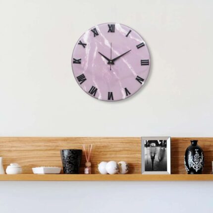 This 16-inch handmade wooden wall clock, featuring a charming pink and white acrylic print, adds a touch of elegance to any home or office décor.