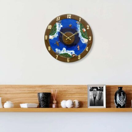 This 16-inch handmade wooden wall clock features a beautiful ocean blue, green, and white acrylic print, adding elegance to any home or office décor.